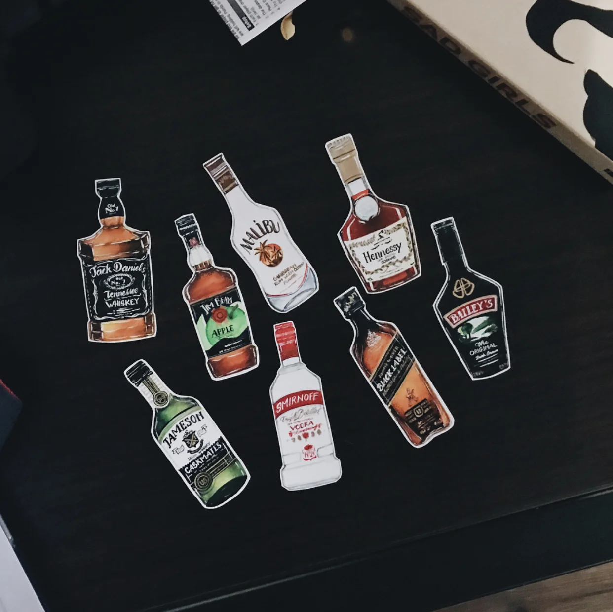 Painting is my alone time. I usually use it as an excuse to stay in with a cup of coffee/warm drinks, put on a show, avoid human contacts, and get in my zone with all the brushes, colors, ink bottles, etc… At the time, I was very interested in liquor as in the design of the bottles and how the color of the liquor shines through; so I thought, hey lets just study them by painting them :) Later on, I turned these illustrations into stickers and used them as gifts/giveaways/little things to give as a way to introduce myself to new people. Here they are: